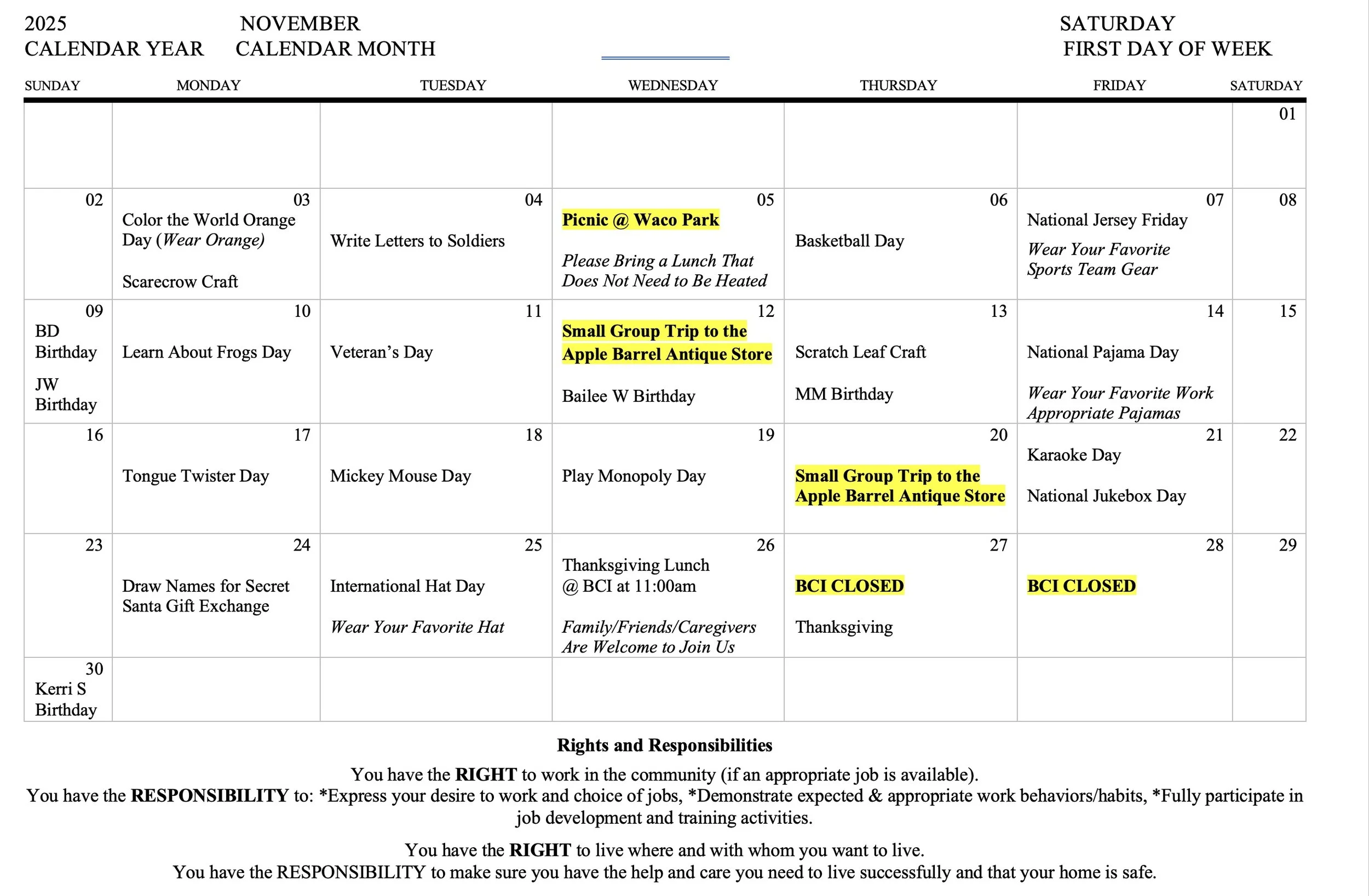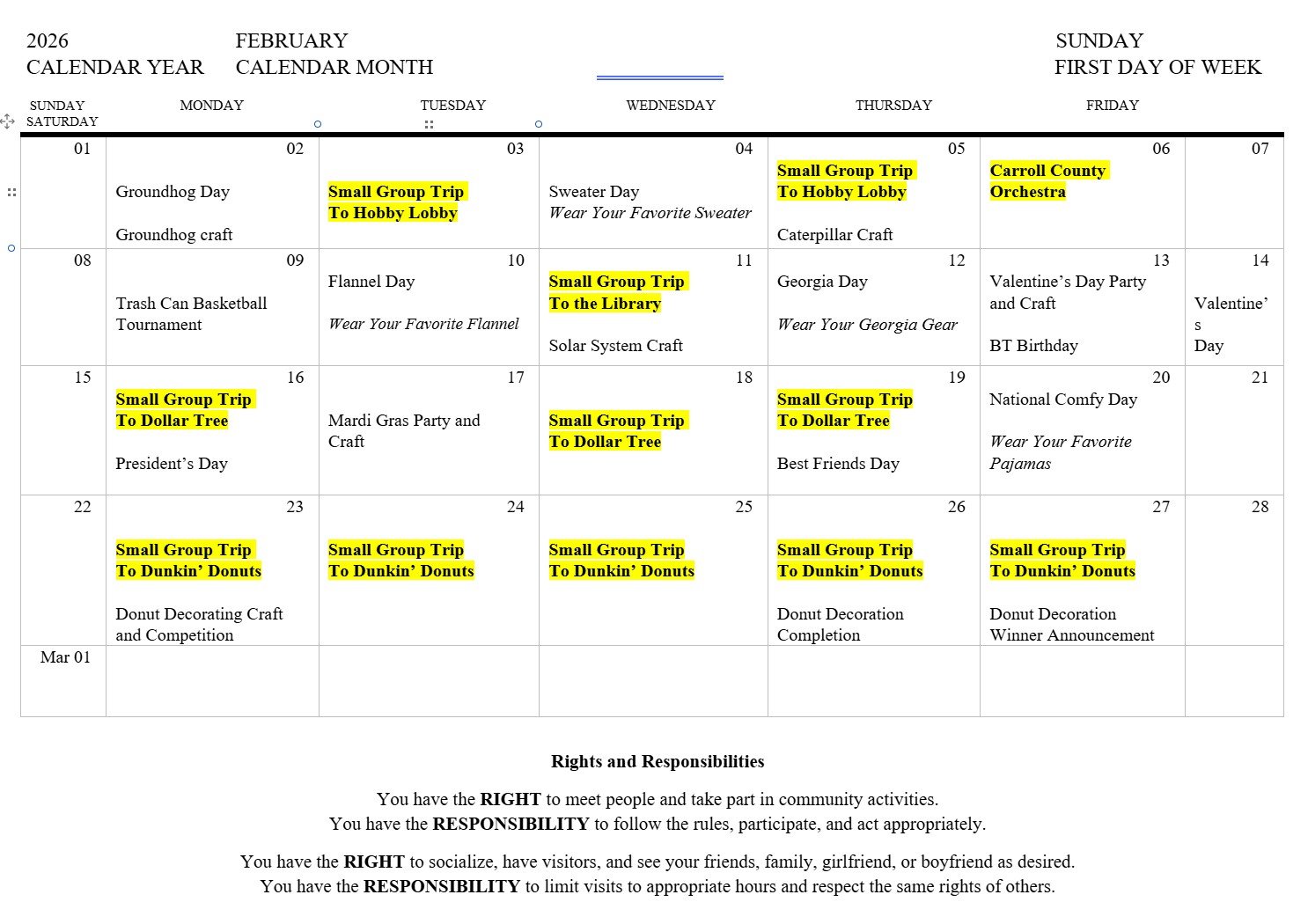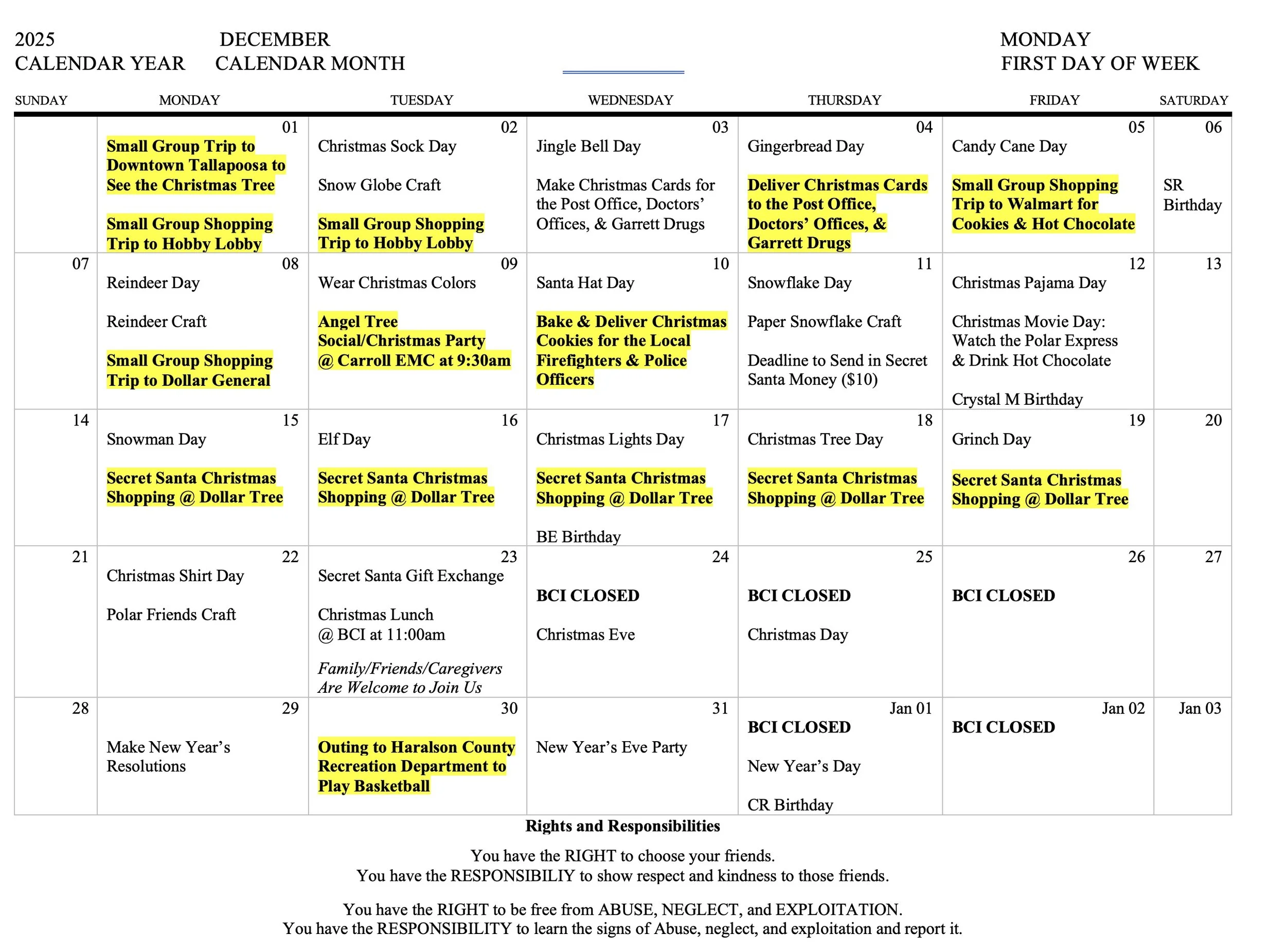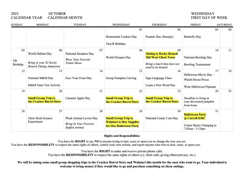 Our monthly calendar is listed below! Be sure to follow it to see what activities are happening on certain days!